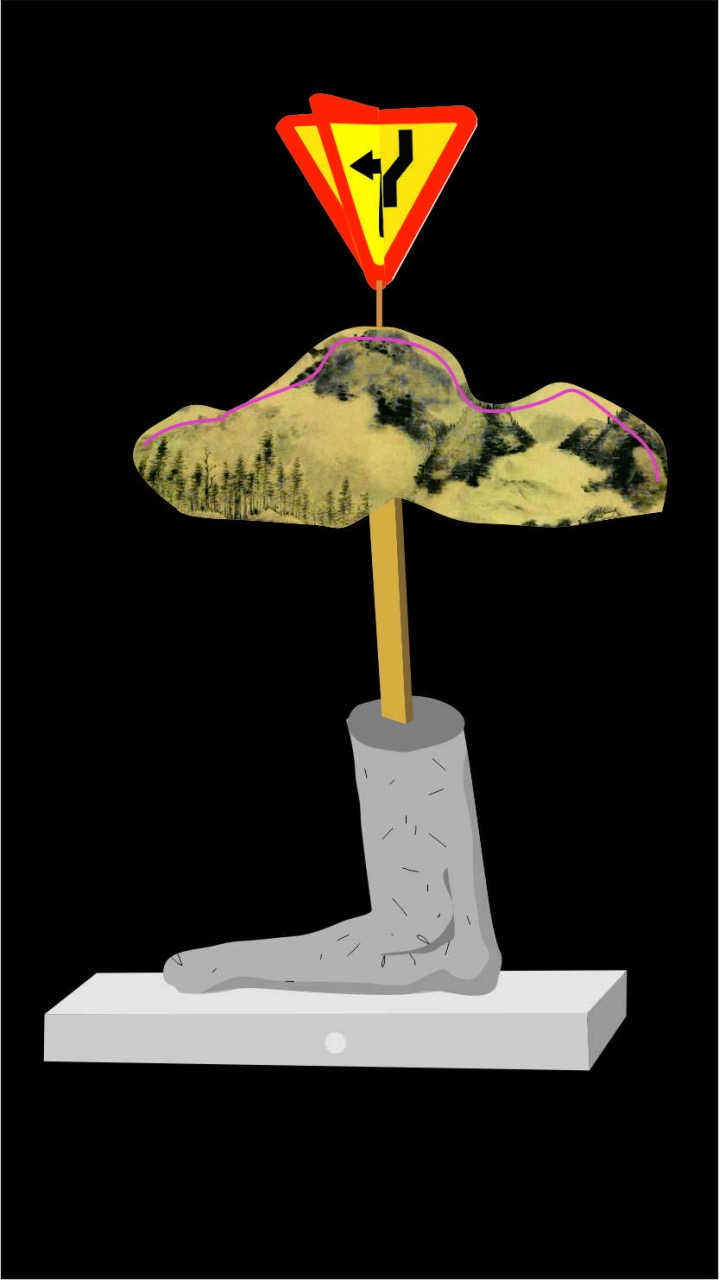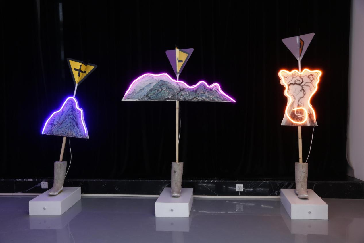 作品名称:卧游 作者:陈胄 作品尺寸:高80CMX长50CMX宽30CM 材料: 水泥鞋墩子1个,交通标牌2块,风景标牌1块,霓虹灯管、电线若干,红外线距离传感器。
